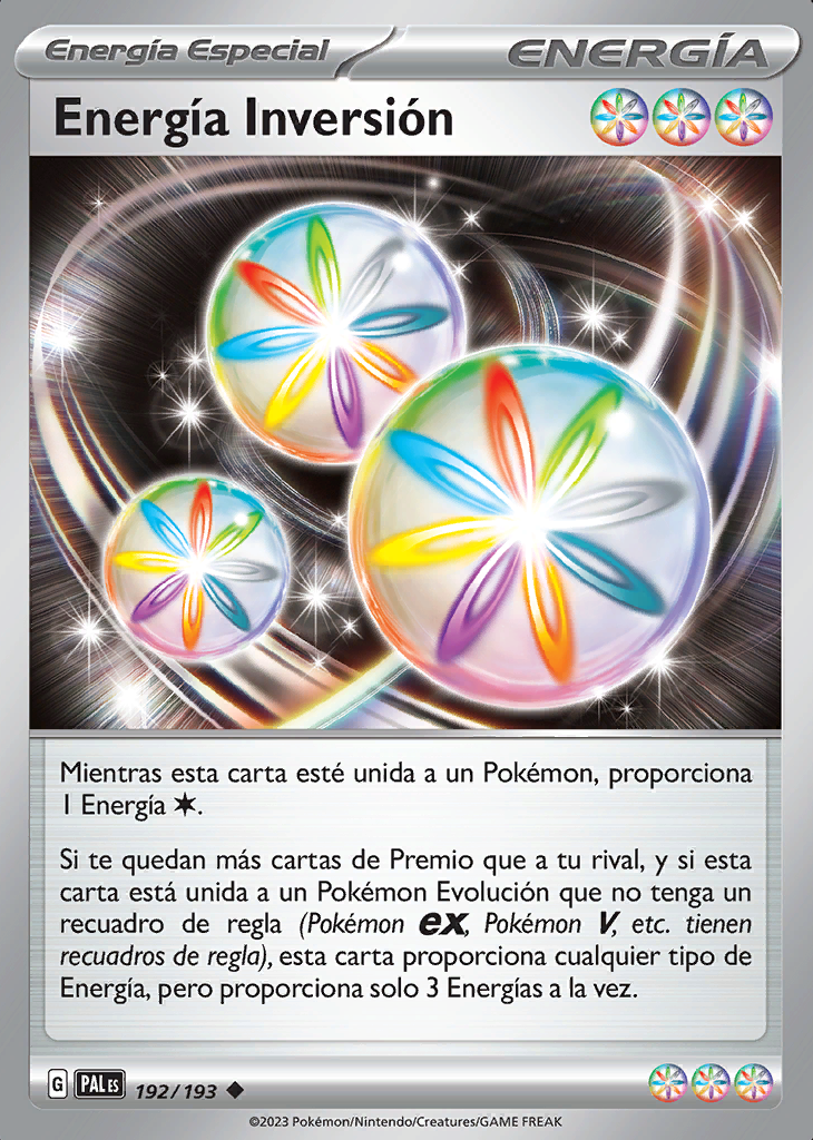 Mientras esta carta esté unida a un Pokémon, proporciona 1 Energía . Si te quedan más cartas de Premio que a tu rival, y si esta carta está unida a un Pokémon Evolución que no tenga un recuadro de regla (Pokémon ex, Pokémon V, etc. tienen recuadros de regla), esta carta proporciona cualquier tipo de Energía, pero proporciona solo 3 Energías a la vez. |