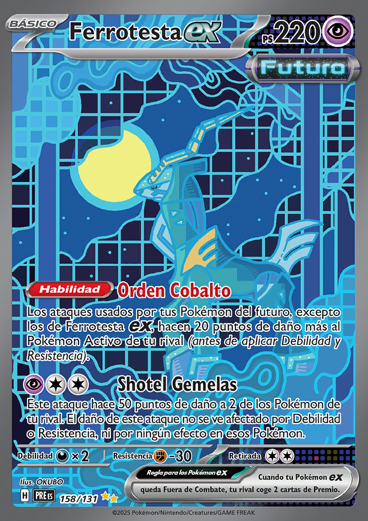 | Los ataques usados por tus Pokémon del futuro, excepto los de Ferrotesta ex, hacen 20 puntos de daño más al Pokémon Activo de tu rival (antes de aplicar Debilidad y Resistencia). | |