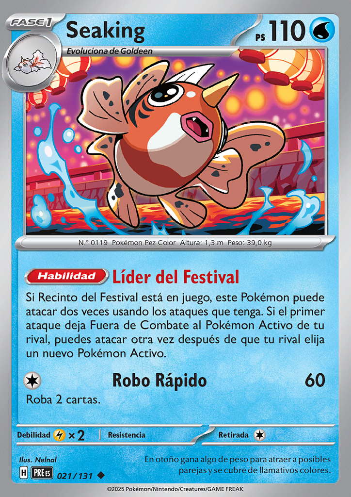 | Si Recinto del Festival está en juego, este Pokémon puede atacar dos veces usando los ataques que tenga. Si el primer ataque deja Fuera de Combate al Pokémon Activo de tu rival, puedes atacar otra vez después de que tu rival elija un nuevo Pokémon Activo. | |