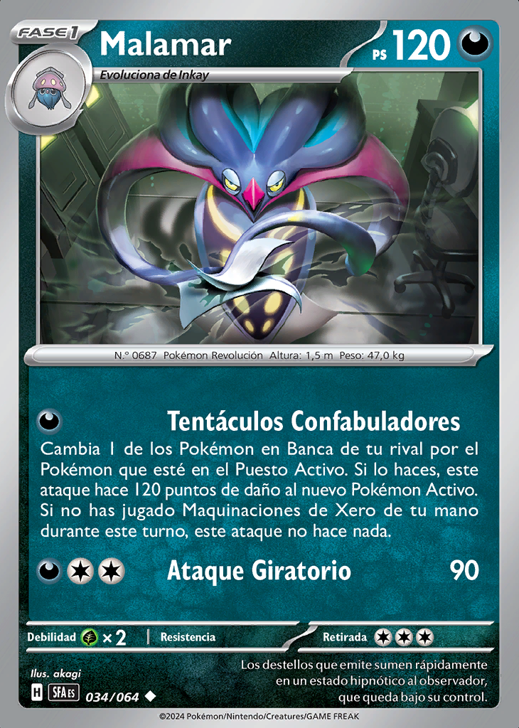 Tentáculos Confabuladores Cambia 1 de los Pokémon en Banca de tu rival por el Pokémon que esté en el Puesto Activo. Si lo haces, este ataque hace 120 puntos de daño al nuevo Pokémon Activo. Si no has jugado Maquinaciones de Xero de tu mano durante este turno, este ataque no hace nada. |