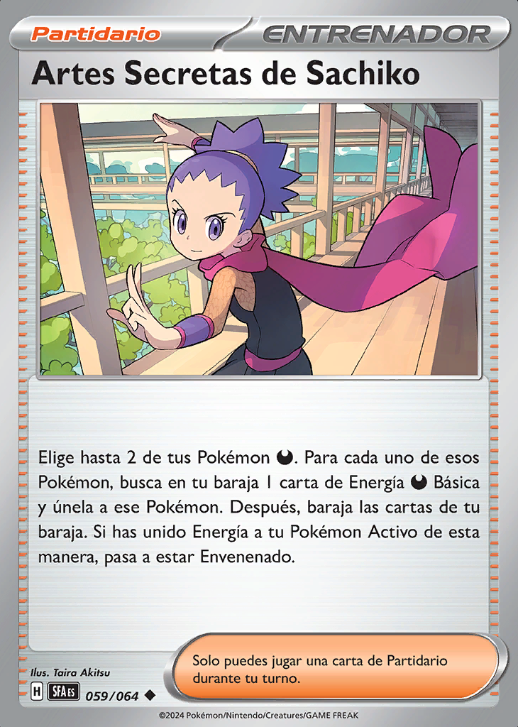 | Elige hasta 2 de tus Pokémon . Para cada uno de esos Pokémon, busca en tu baraja 1 carta de Energía Básica y únela a ese Pokémon. Después, baraja las cartas de tu baraja. Si has unido Energía a tu Pokémon Activo de esta manera, pasa a estar Envenenado. |
