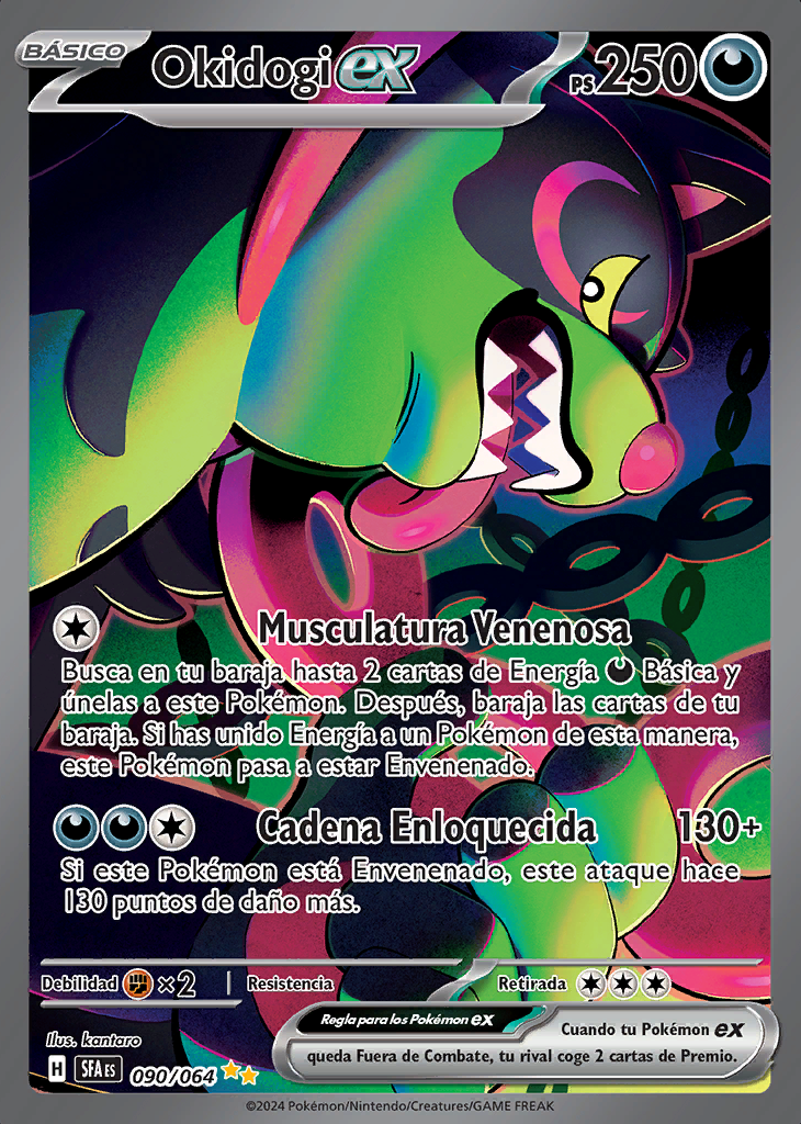 Musculatura Venenosa Busca en tu baraja hasta 2 cartas de Energía Básica y únelas a este Pokémon. Después, baraja las cartas de tu baraja. Si has unido Energía a un Pokémon de esta manera, este Pokémon pasa a estar Envenenado. |
