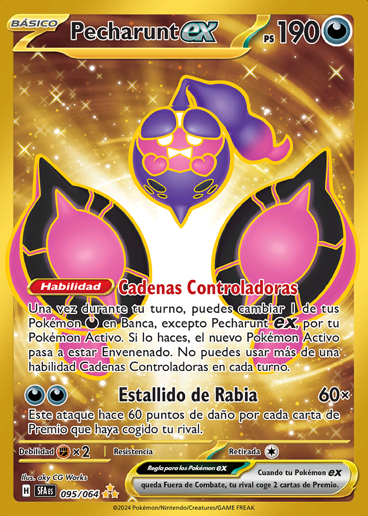 | Una vez durante tu turno, puedes cambiar 1 de tus Pokémon en Banca, excepto Pecharunt ex, por tu Pokémon Activo. Si lo haces, el nuevo Pokémon Activo pasa a estar Envenenado. No puedes usar más de una habilidad Cadenas Controladoras en cada turno. | |