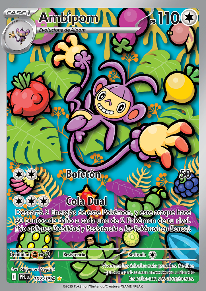 Doble Cola Descarta 2 Energías de este Pokémon, y este ataque hace 60 puntos de daño a cada uno de los 2 Pokémon de tu rival que elijas. (No apliques Debilidad y Resistencia a los Pokémon en Banca). |