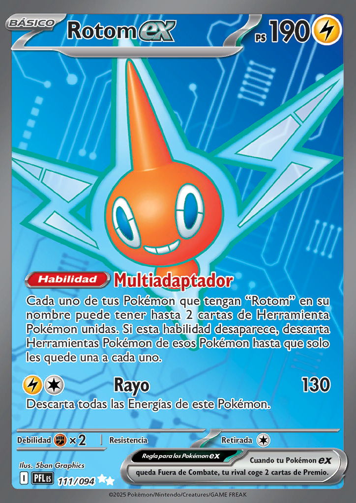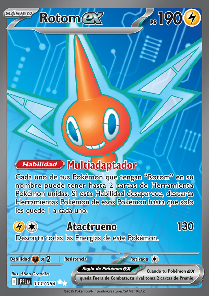 | Cada uno de tus Pokémon que tengan “Rotom” en su nombre puede tener hasta 2 cartas de Herramienta Pokémon unidas. Si esta habilidad desaparece, descarta Herramientas Pokémon de esos Pokémon hasta que sólo les quede una a cada uno. | |