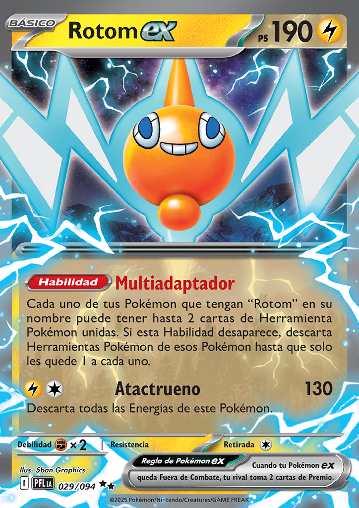 | Cada uno de tus Pokémon que tengan “Rotom” en su nombre puede tener hasta 2 cartas de Herramienta Pokémon unidas. Si esta habilidad desaparece, descarta Herramientas Pokémon de esos Pokémon hasta que sólo les quede una a cada uno. | |