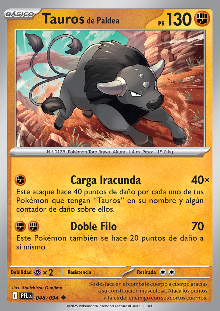 Carga Furiosa Este ataque hace 40 puntos de daño por cada uno de tus Pokémon que tengan “Tauros” en su nombre y algún contador de daño sobre ellos. |