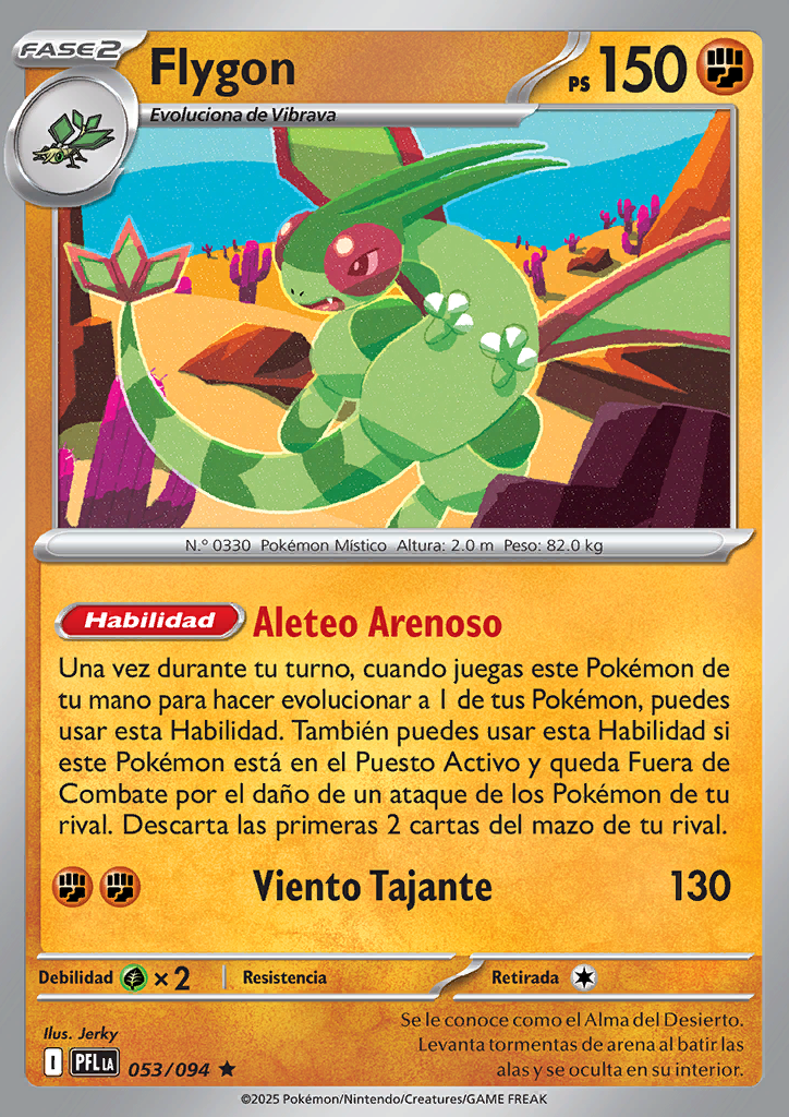 | Una vez durante tu turno, cuando juegas este Pokémon de tu mano para hacer evolucionar a uno de tus Pokémon, puedes usar esta habilidad. También puedes usar esta habilidad si este Pokémon está en el Puesto Activo y queda Fuera de Combate por el daño de un ataque de los Pokémon de tu rival. Descarta las 2 primeras cartas de la baraja de tu rival. | |