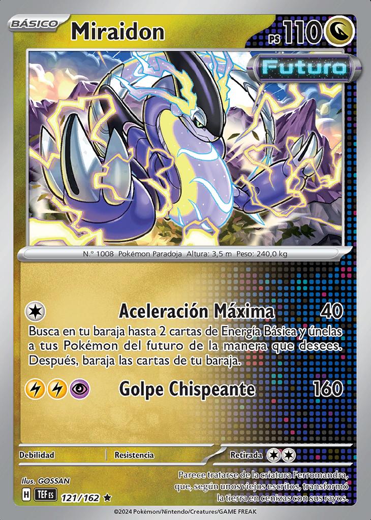 Aceleración Máxima Busca en tu baraja hasta 2 cartas de Energía Básica y únelas a tus Pokémon del futuro de la manera que desees. Después, baraja las cartas de tu baraja. |