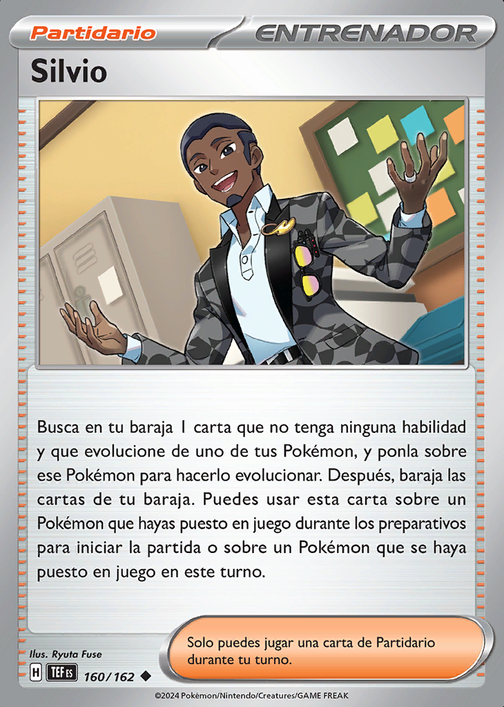 | Busca en tu baraja 1 carta que no tenga ninguna habilidad y que evolucione de uno de tus Pokémon, y ponla sobre ese Pokémon para hacerlo evolucionar. Después, baraja las cartas de tu baraja. Puedes usar esta carta sobre un Pokémon que hayas puesto en juego durante los preparativos para iniciar la partida o sobre un Pokémon que se haya puesto en juego en este turno. |