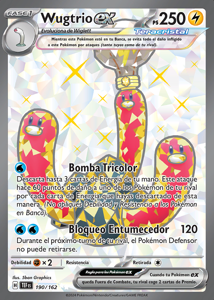 Bomba Tricolor Descarta hasta 3 cartas de Energía de tu mano. Este ataque hace 60 puntos de daño a uno de los Pokémon de tu rival por cada carta de Energía que hayas descartado de esta manera. (No apliques Debilidad y Resistencia a los Pokémon en Banca). |