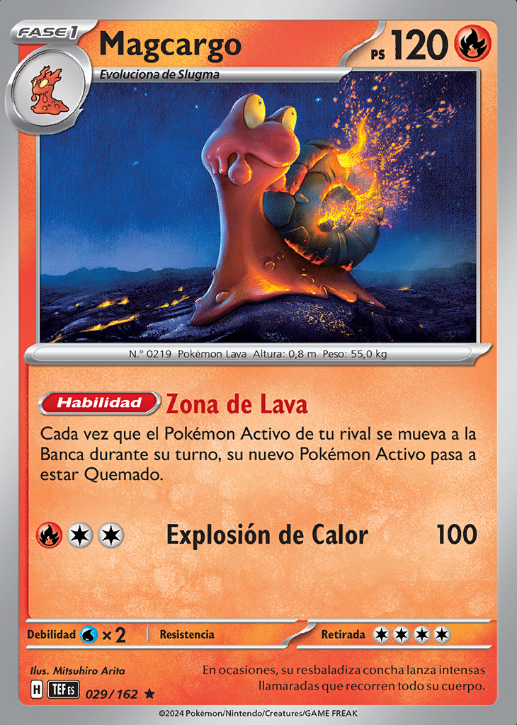 | Cada vez que el Pokémon Activo de tu rival se mueva a la Banca durante su turno, su nuevo Pokémon Activo pasa a estar Quemado. | |