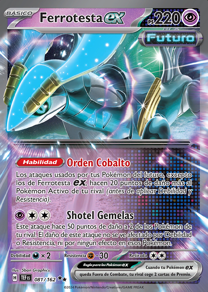 | Los ataques usados por tus Pokémon del futuro, excepto los de Ferrotesta ex, hacen 20 puntos de daño más al Pokémon Activo de tu rival (antes de aplicar Debilidad y Resistencia). | |