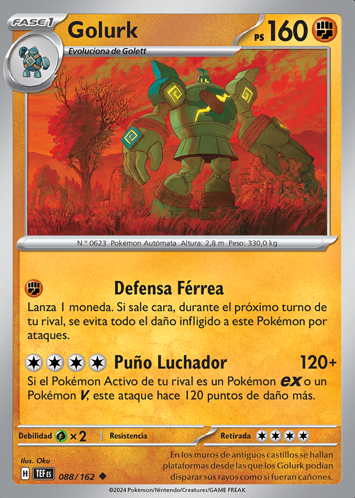Defensa Férrea Lanza 1 moneda. Si sale cara, durante el próximo turno de tu rival, se evita todo el daño infligido a este Pokémon por ataques. |
