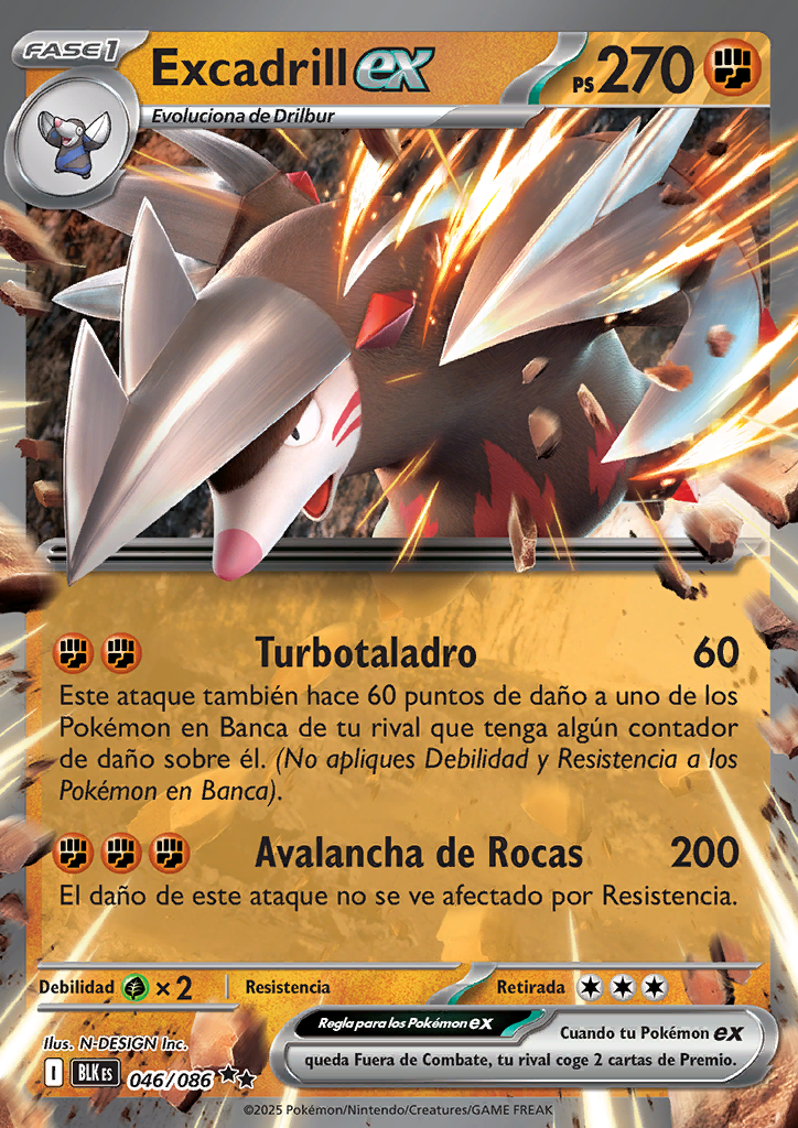 Turbotaladro Este ataque también hace 60 puntos de daño a uno de los Pokémon en Banca de tu rival que tenga algún contador de daño sobre él. (No apliques Debilidad ni Resistencia a los Pokémon en Banca). |