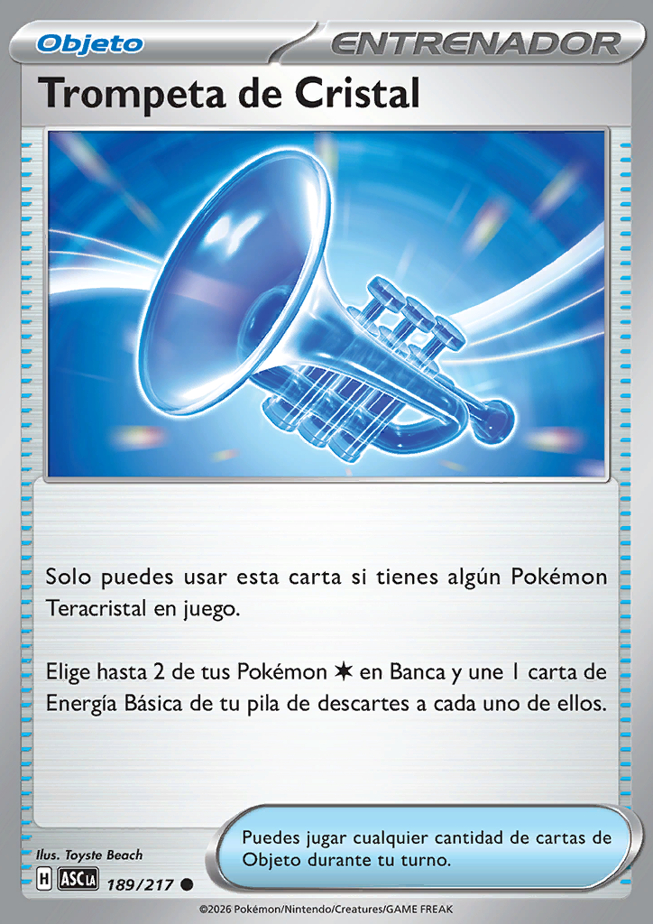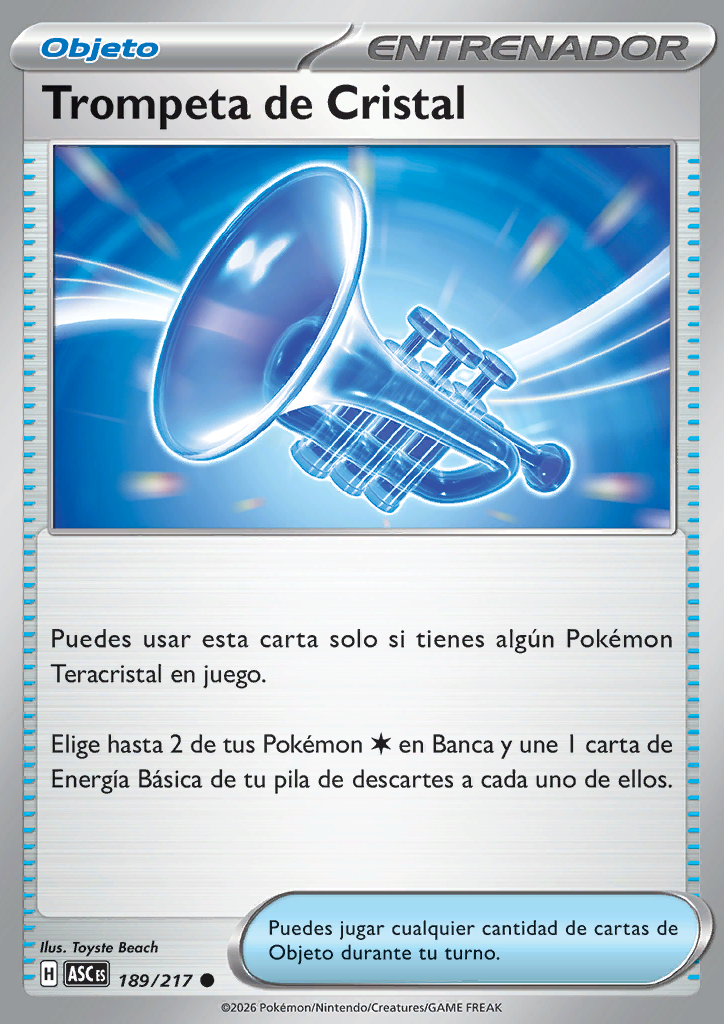 Puedes usar esta carta solo si tienes algún Pokémon Teracristal en juego. Elige hasta 2 de tus Pokémon en Banca y une 1 carta de Energía Básica de tu pila de descartes a cada uno de ellos. |