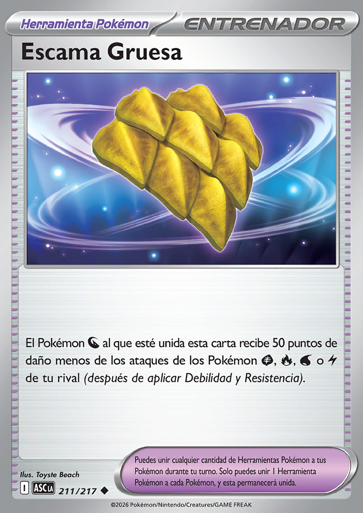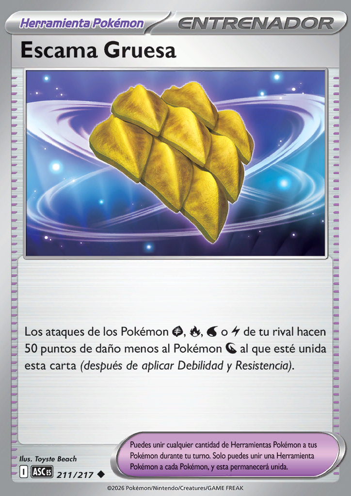 | Los ataques de los Pokémon , , o de tu rival hacen 50 puntos de daño menos al Pokémon al que esté unida esta carta (después de aplicar Debilidad y Resistencia). |