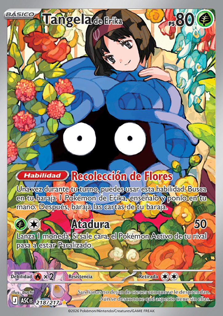 | Una vez durante tu turno, puedes usar esta habilidad. Busca en tu baraja 1 Pokémon de Erika, enséñalo y ponlo en tu mano. Después, baraja las cartas de tu baraja. | |