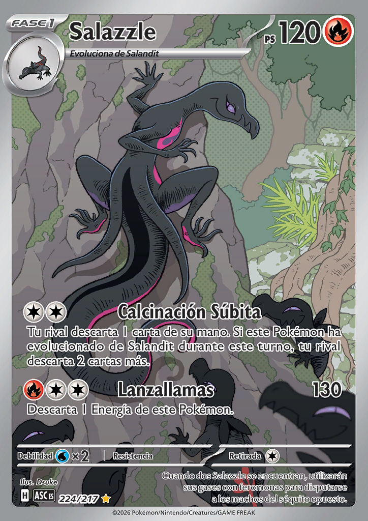 Calcinación Súbita Tu rival descarta 1 carta de su mano. Si este Pokémon ha evolucionado de Salandit durante este turno, tu rival descarta 2 cartas más. |
