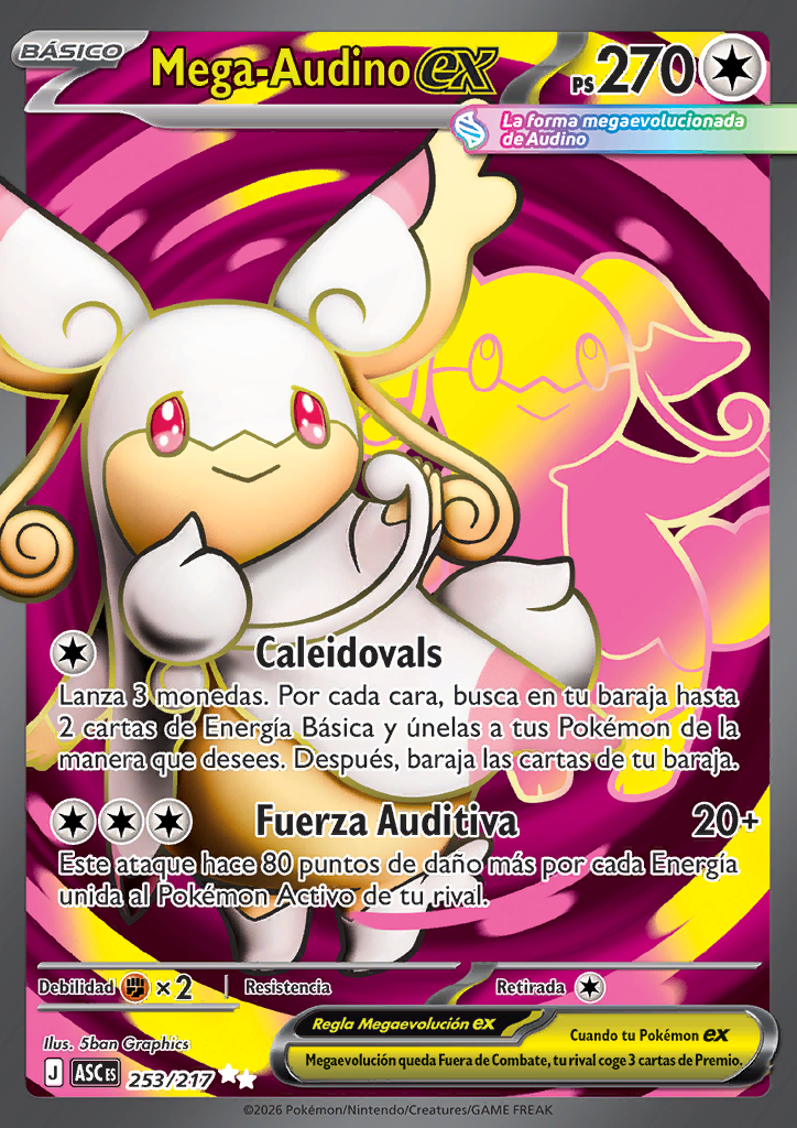 Fuerza Auditiva Este ataque hace 80 puntos de daño más por cada Energía unida al Pokémon Activo de tu rival. |