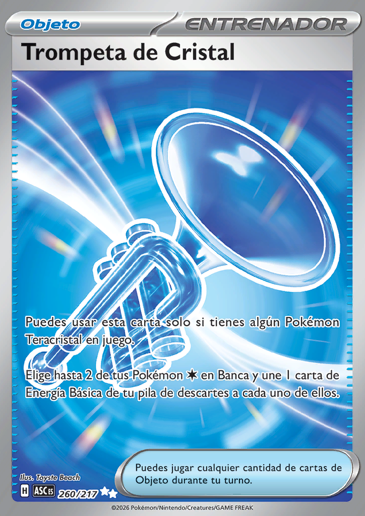 Puedes usar esta carta solo si tienes algún Pokémon Teracristal en juego. Elige hasta 2 de tus Pokémon en Banca y une 1 carta de Energía Básica de tu pila de descartes a cada uno de ellos. |