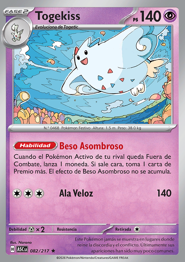 | Cuando el Pokémon Activo de tu rival queda Fuera de Combate, lanza 1 moneda. Si sale cara, coge 1 carta de Premio más. El efecto de Beso Asombroso no se acumula. | |