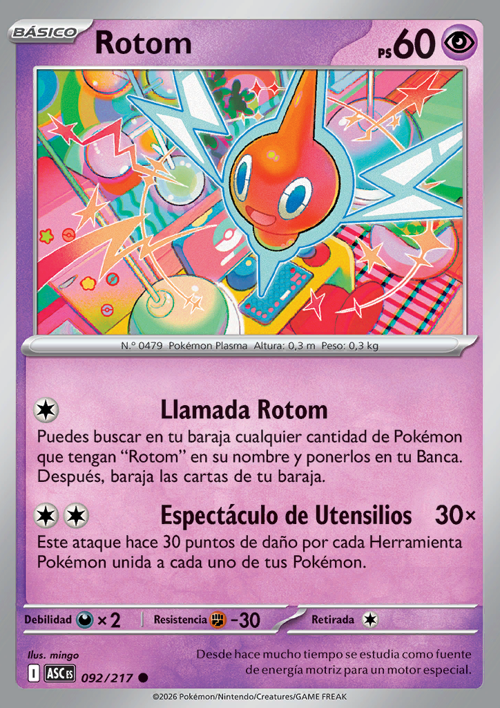 Llamada Rotom Puedes buscar en tu baraja cualquier cantidad de Pokémon que tengan “Rotom” en su nombre y ponerlos en tu Banca. Después, baraja las cartas de tu baraja. |