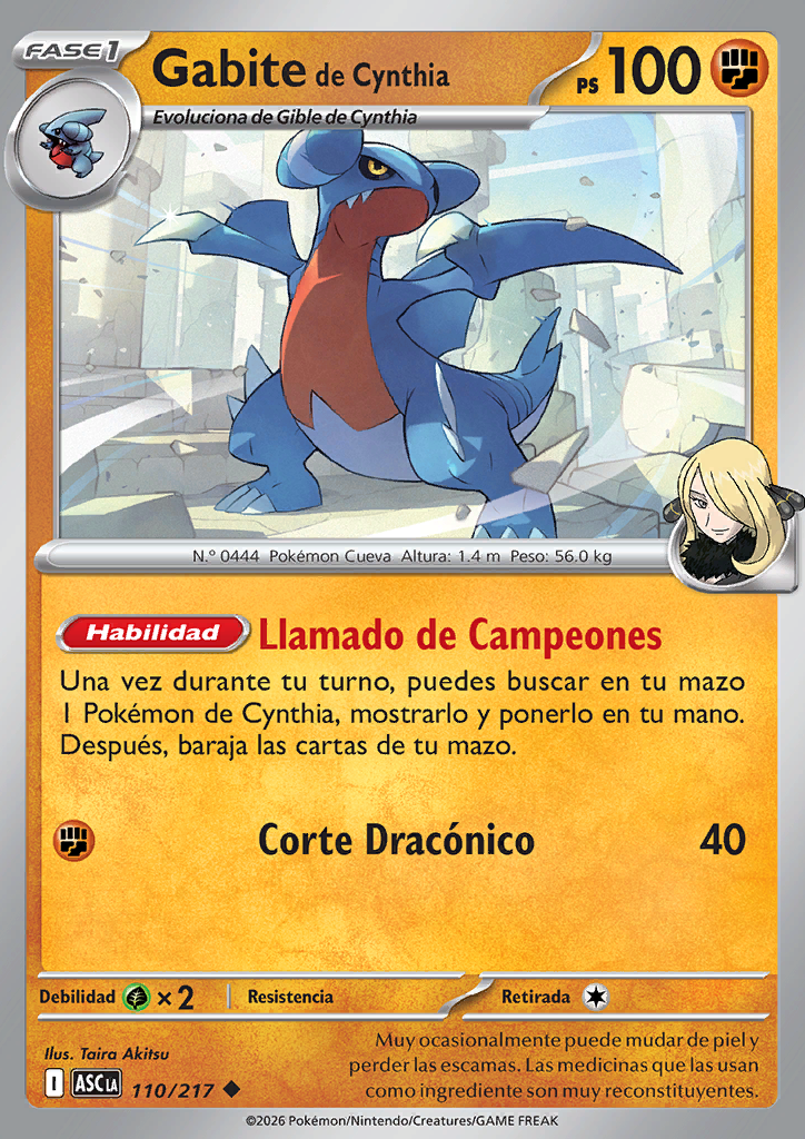 | Una vez durante tu turno, puedes buscar en tu baraja 1 Pokémon de Cintia, enseñarlo y ponerlo en tu mano. Después, baraja las cartas de tu baraja. | |