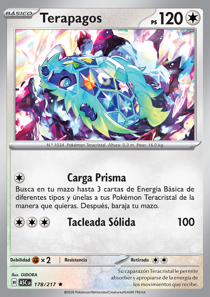 Carga Prisma Busca en tu baraja hasta 3 cartas de Energía Básica de diferentes tipos y únelas a tus Pokémon Teracristal de la manera que desees. Después, baraja las cartas de tu baraja. |