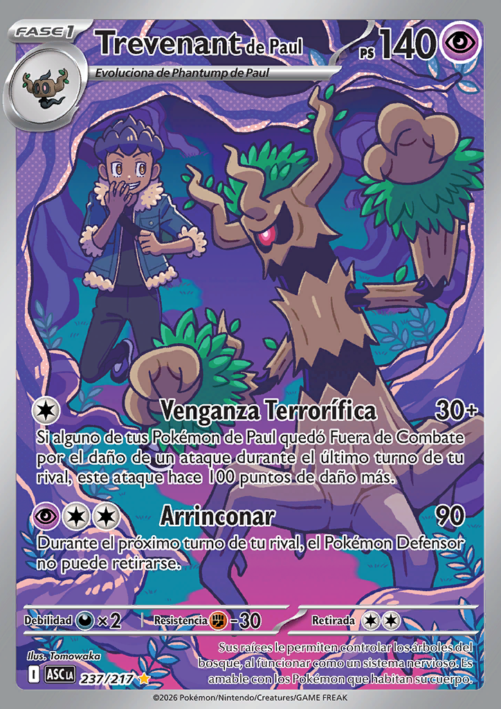 Venganza Espeluznante Si alguno de tus Pokémon de Paul quedó Fuera de Combate por el daño de un ataque durante el último turno de tu rival, este ataque hace 100 puntos de daño más. |