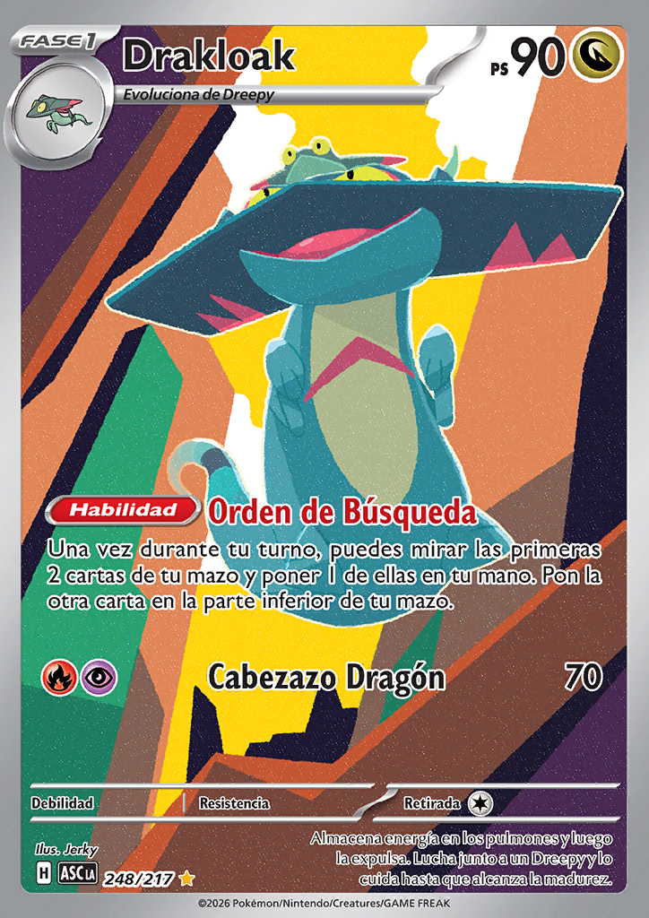 | Una vez durante tu turno, puedes mirar las 2 primeras cartas de tu baraja y poner 1 de ellas en tu mano. Pon la otra carta en la parte inferior de tu baraja. | |