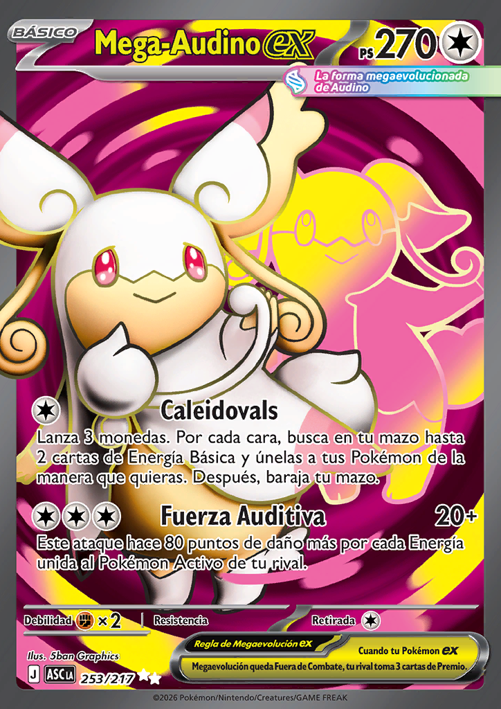 Fuerza Auditiva Este ataque hace 80 puntos de daño más por cada Energía unida al Pokémon Activo de tu rival. |