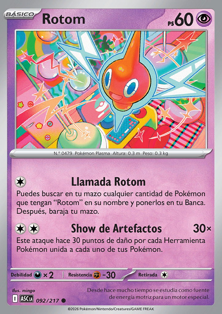 Llamada Rotom Puedes buscar en tu baraja cualquier cantidad de Pokémon que tengan “Rotom” en su nombre y ponerlos en tu Banca. Después, baraja las cartas de tu baraja. |