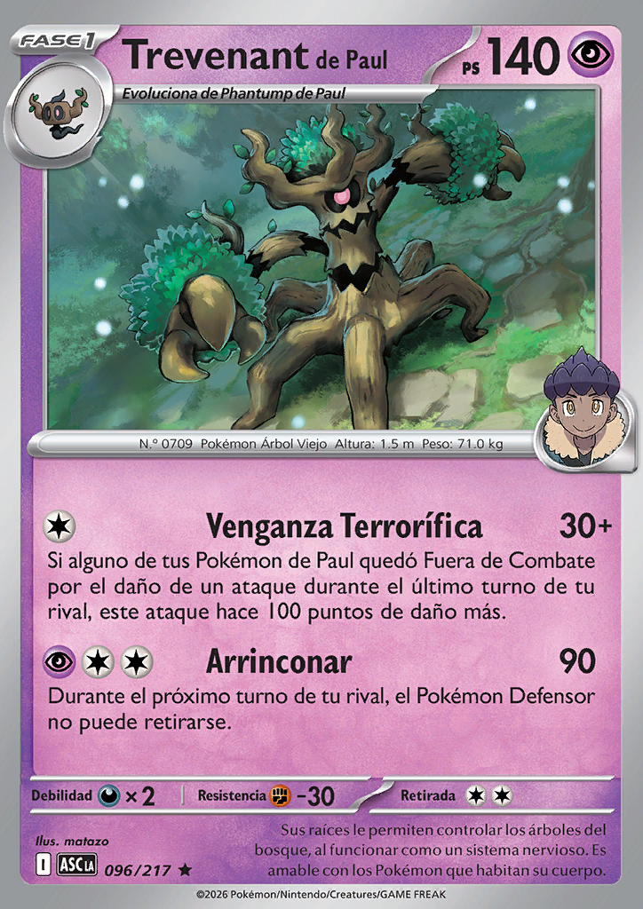 Venganza Espeluznante Si alguno de tus Pokémon de Paul quedó Fuera de Combate por el daño de un ataque durante el último turno de tu rival, este ataque hace 100 puntos de daño más. |