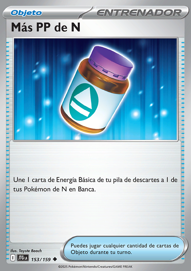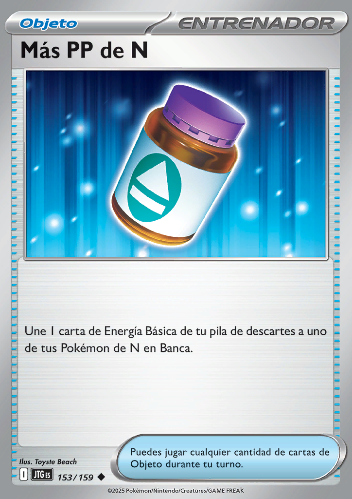 | Une 1 carta de Energía Básica de tu pila de descartes a uno de tus Pokémon de N en Banca. |