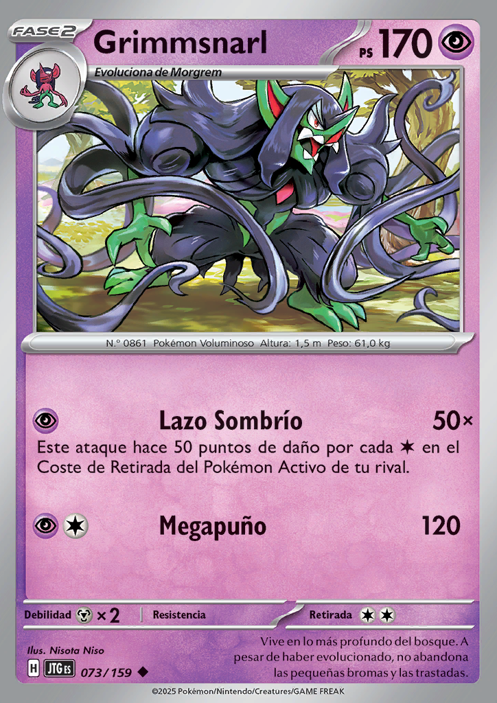 Lazo Sombrío Este ataque hace 50 puntos de daño por cada en el Coste de Retirada del Pokémon Activo de tu rival. |