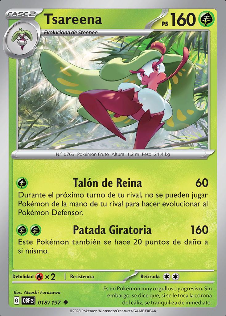 Talón de Reina Durante el próximo turno de tu rival, no se pueden jugar Pokémon de la mano de tu rival para hacer evolucionar al Pokémon Defensor. |