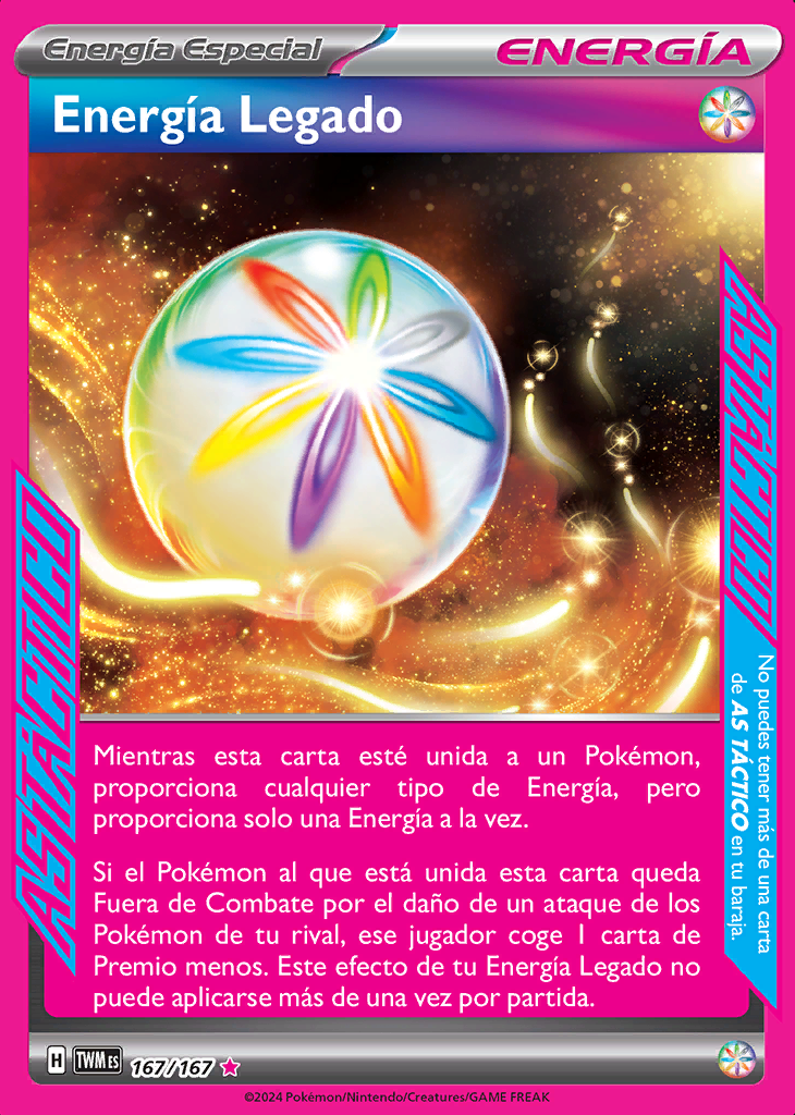 Mientras esta carta esté unida a un Pokémon, proporciona cualquier tipo de Energía, pero proporciona solo una Energía a la vez. Si el Pokémon al que está unida esta carta queda Fuera de Combate por el daño de un ataque de los Pokémon de tu rival, ese jugador coge 1 carta de Premio menos. Este efecto de tu Energía Legado no puede aplicarse más de una vez por partida. |