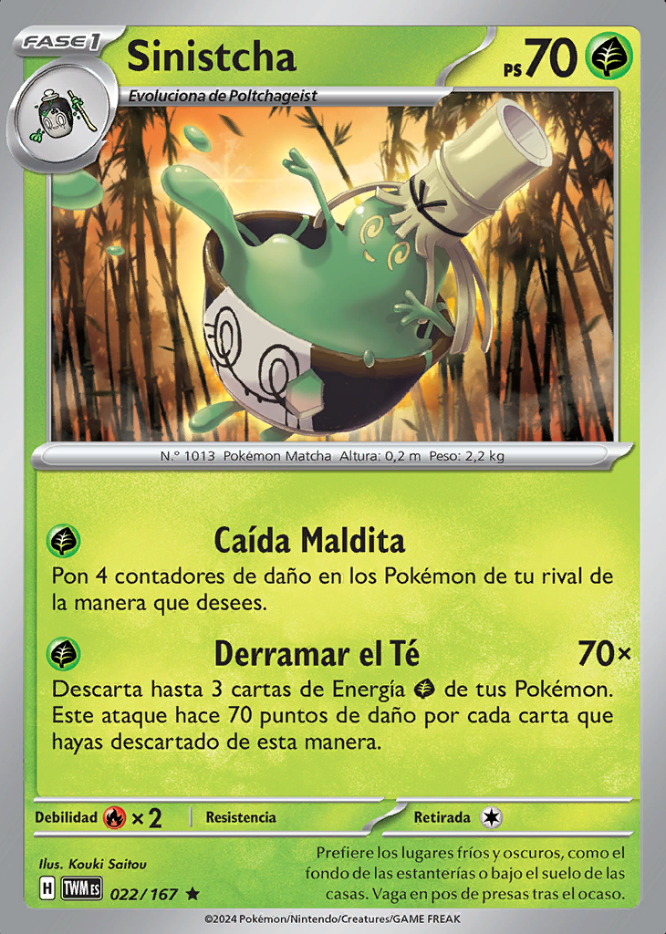 Derramar el Té Descarta hasta 3 cartas de Energía de tus Pokémon. Este ataque hace 70 puntos de daño por cada carta que hayas descartado de esta manera. |