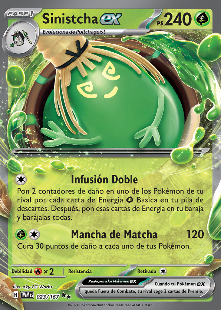 Infusión Doble Pon 2 contadores de daño en uno de los Pokémon de tu rival por cada carta de Energía Básica en tu pila de descartes. Después, pon esas cartas de Energía en tu baraja y barájalas todas. |