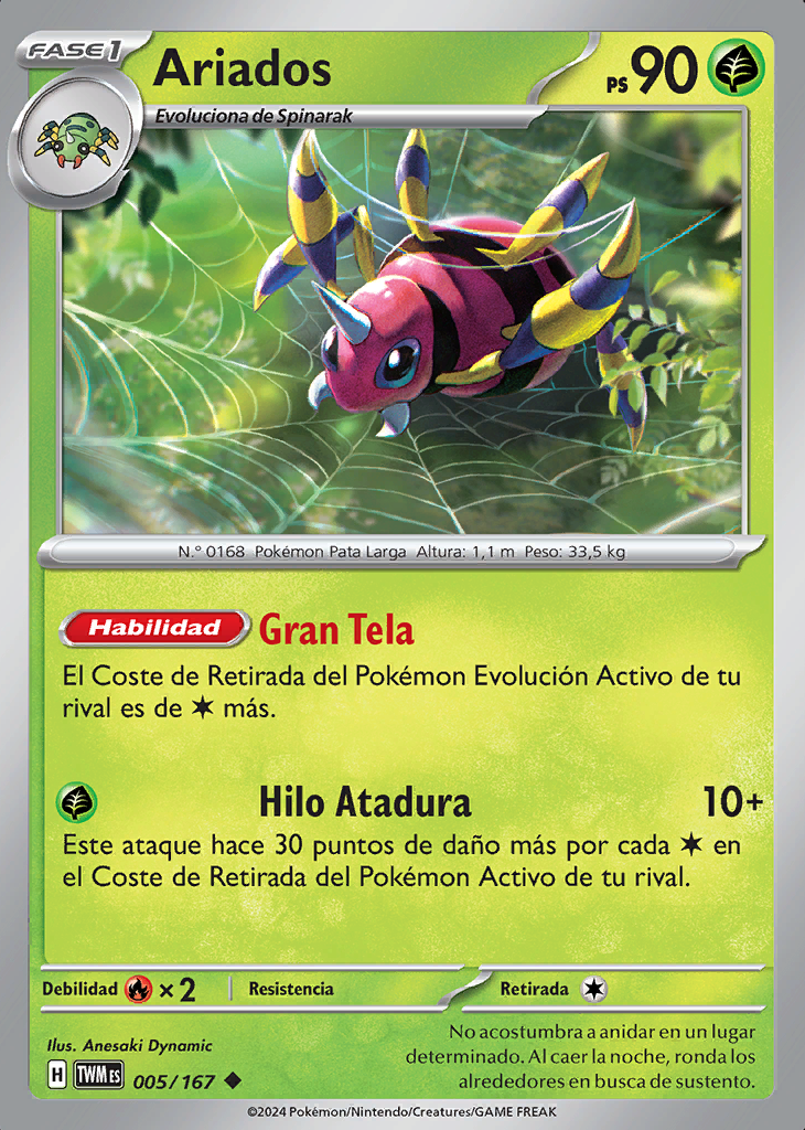 Hilo Atadura Este ataque hace 30 puntos de daño más por cada en el Coste de Retirada del Pokémon Activo de tu rival. |