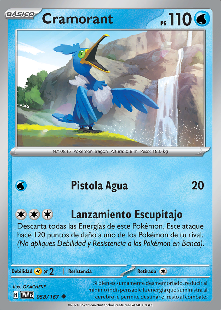Lanzamiento Escupitajo Descarta todas las Energías de este Pokémon. Este ataque hace 120 puntos de daño a uno de los Pokémon de tu rival. (No apliques Debilidad y Resistencia a los Pokémon en Banca). |