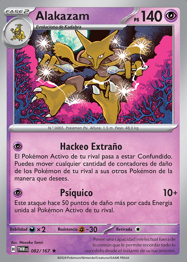 Psíquico Este ataque hace 50 puntos de daño más por cada Energía unida al Pokémon Activo de tu rival. |