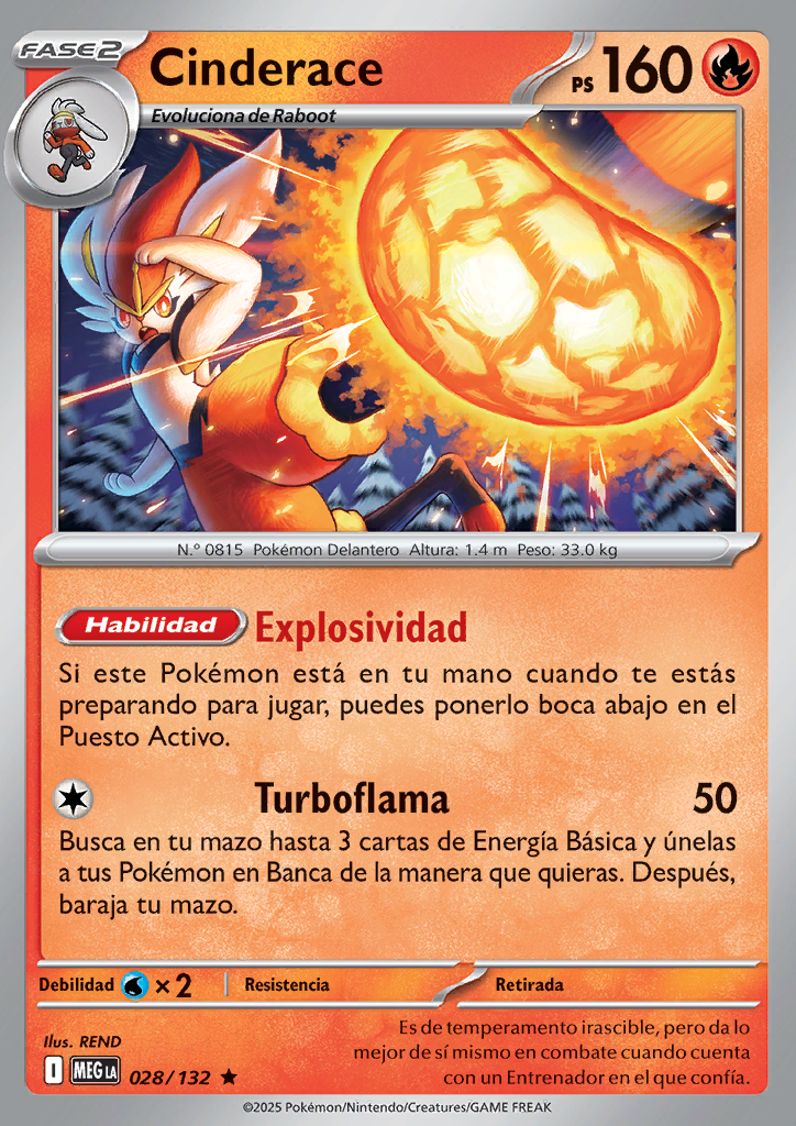 Turbollamarada Busca en tu baraja hasta 3 cartas de Energía Básica y únelas a tus Pokémon en Banca de la manera que desees. Después, baraja las cartas de tu baraja. |