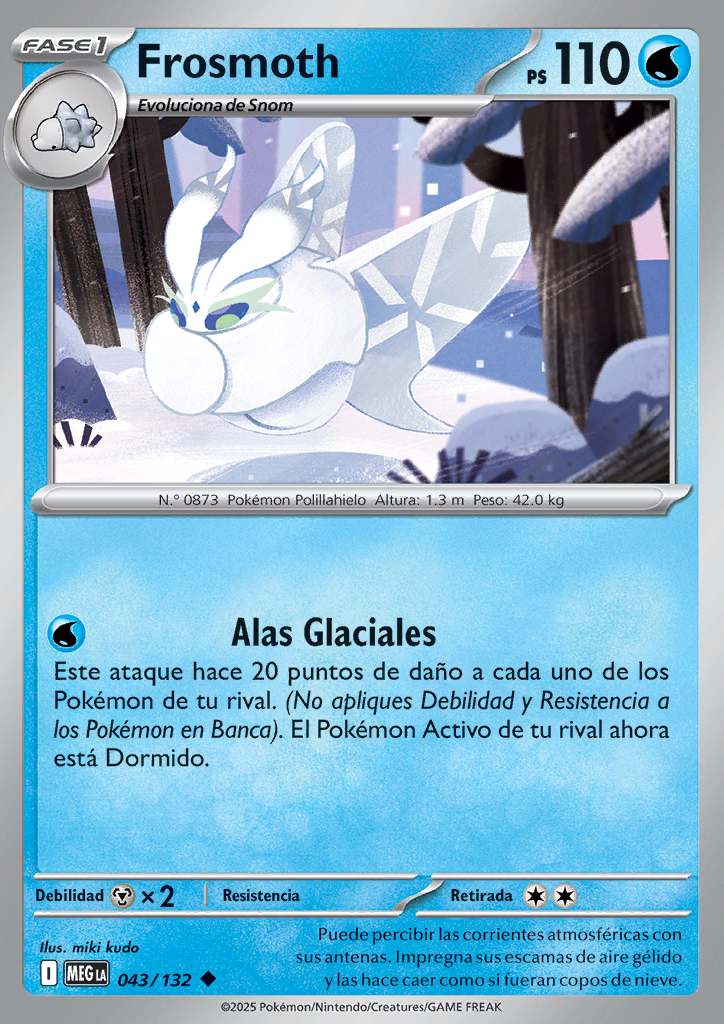 Alas Glaciales Este ataque hace 20 puntos de daño a cada uno de los Pokémon de tu rival. (No apliques Debilidad y Resistencia a los Pokémon en Banca). El Pokémon Activo de tu rival pasa a estar Dormido. |