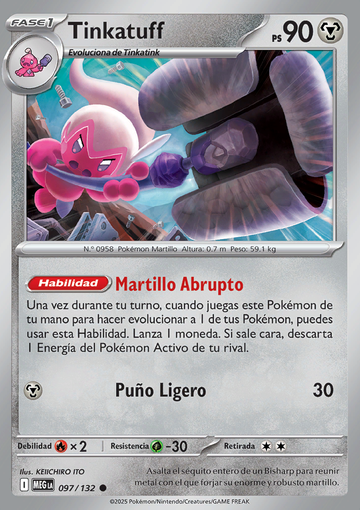 | Una vez durante tu turno, cuando juegas este Pokémon de tu mano para hacer evolucionar a uno de tus Pokémon, puedes usar esta habilidad. Lanza 1 moneda. Si sale cara, descarta 1 Energía del Pokémon Activo de tu rival. | |