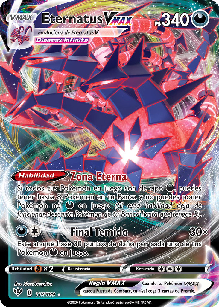 Cuando tu Pokémon VMAX queda Fuera de Combate, tu rival coge 3 cartas de Premio. |