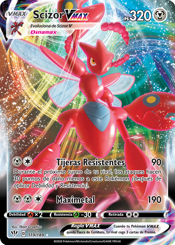 Cuando tu Pokémon VMAX queda Fuera de Combate, tu rival coge 3 cartas de Premio. |