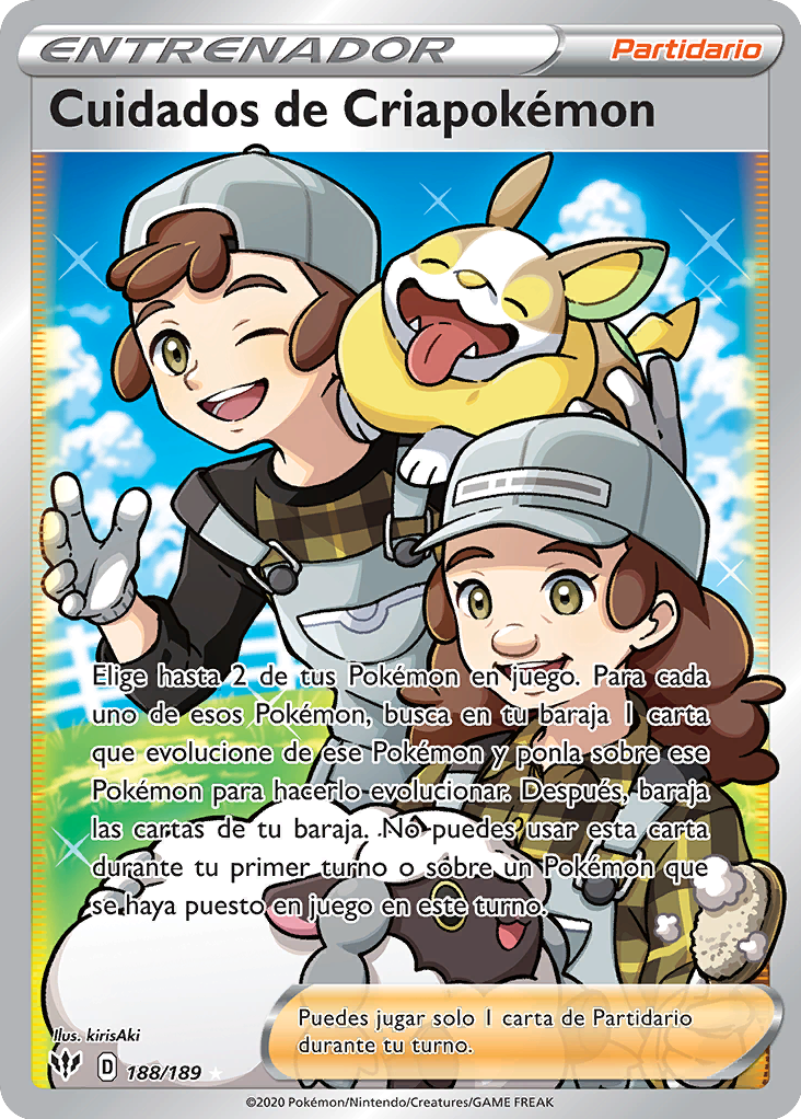 | Elige hasta 2 de tus Pokémon en juego. Para cada uno de esos Pokémon, busca en tu baraja 1 carta que evolucione de ese Pokémon y ponla sobre ese Pokémon para hacerlo evolucionar. Después, baraja las cartas de tu baraja. No puedes usar esta carta durante tu primer turno o sobre un Pokémon que se haya puesto en juego en este turno. |