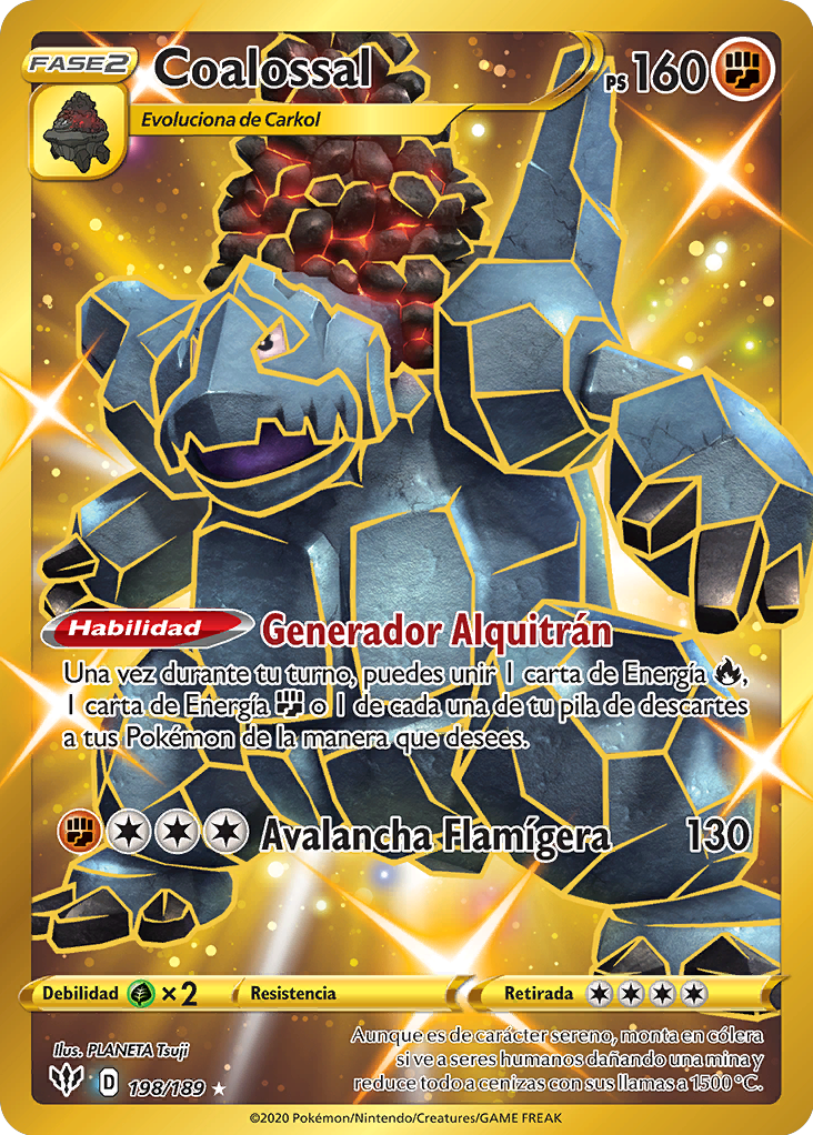 | Una vez durante tu turno, puedes unir 1 carta de Energía Fire, 1 carta de Energía Fighting o 1 de cada una de tu pila de descartes a tus Pokémon de la manera que desees. | |